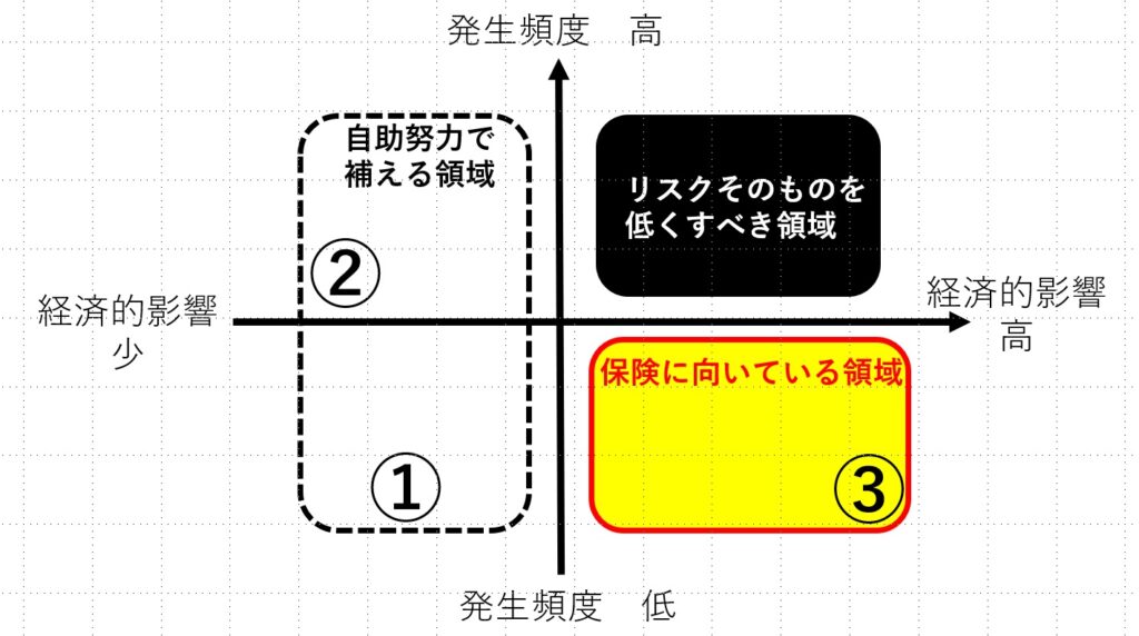 ここで注意しなくてはいけないのが、この「発生頻度」と「経済損失」の図は、人の状況や年齢によって変わるということです。今回は独身の方ですが、もしお子さんがいる方でしたら、万が一のことが起きたときのお金の心配の「経済損失」は大きくなりますよね。